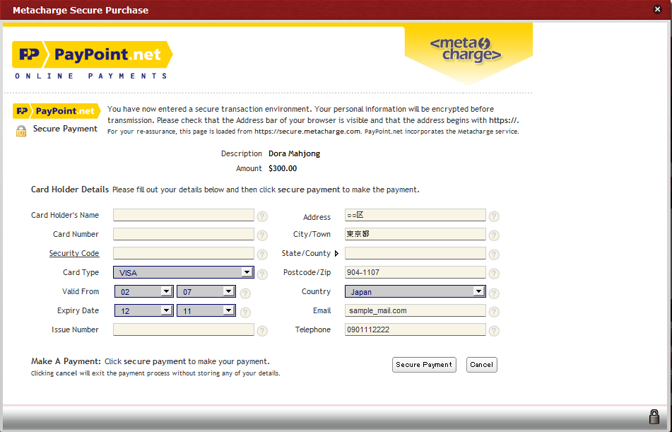 以下の内容を入力し、Secure Paymentを押します(以下が必須項目になります)。
